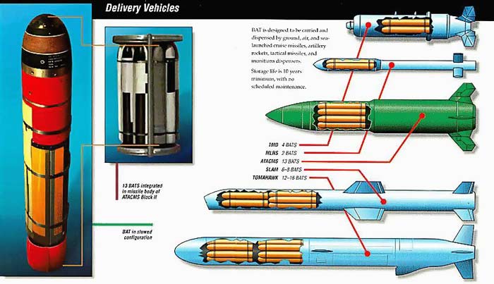 Самонаводящийся боевой элемент BAT (Brilliant Antiarmor Submunition - противотанковый самонаводящийся суббоеприпас) предназначен для поражения передвигающихся бронированных целей (танков, БТР и БМП) в их верхнюю проекцию. Он доставляется ракетным носителем на дальность от 100 до 500 км либо удаленно пилотируемым летательным аппаратом (ДПЛА) в границах данной тактической дальности. В предстоящем поиск и поражение цели выполняются им в автономном режиме. СНБЭ BAT разработан американской компанией Northrop Grumman. На его базе были сделаны улучшенные варианты: