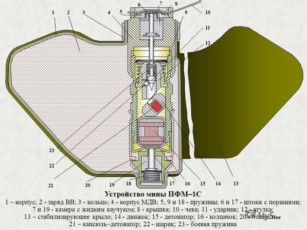 Главные тактико-технические свойства мины ПФМ-1С Тип мины - фугасная Масса, кг: - мины 0,08 - заряда ВВ (жидкое, ВС-6Д) 0,04 Габаритные размеры, мм 119x64x20 Материал корпуса - целофан Тип взрывателя - гидромеханический нажимного деяния с механизмом самоликвидации Усилие срабатывания, кГс 5-25 Механизм самоликвидации - гидромеханический Время самоликвидации. ч 1-40 (зависимо от температуры и среды) Механизм далекого взведения - гидромеханический Время далекого взведения, мин. 1-10 Температурный спектр внедрения - от -40 до +50°С Гарантийный срок хранения, лет 10