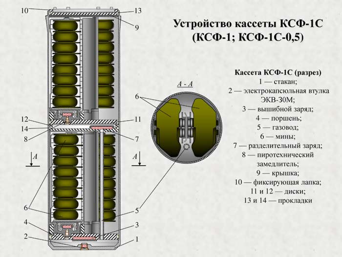 Главными частями кассеты КСФ-1С являются корпус с ввинченной в него электрокапсюльной втулкой ЭКВ-30М, четыре закрытых блока с минами, поршень, диск, газовод, вышибной и разделительный заряды. Корпус закрыт крышкой, которая удерживается загнутыми лапками. Конструкция кассеты герметична. Электрокапсюльная втулка служит для возгорания вышибного заряда, размещенного в поршне. Вышибной заряд обеспечивает выброс блоков из кассеты, возгорание замедлителей нижних блоков и через газовод разделительного заряда. Для исключения прорыва газов в объем кассеты, заполненный минами, поршень и диск имеют уплотнительные кольца.