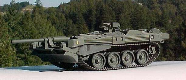 Наведение пушки в вертикальной плоскости осуществляется продольным качанием корпуса за счет регулируемой гидропневматической подвески в границах от -10" до -1-12", в горизонтальной — поворотом танка. Два курсовых 7,62-мм пулемёта установлены в бронированном коробе в левой фронтальной части корпуса, справа от пушки установлен пристрелочный пулемёт, а слева от командирской башенки — зенитный. Для постановки дымовых завес по обе стороны командирской башенки смонтированы четырехствольные гранатомёты.