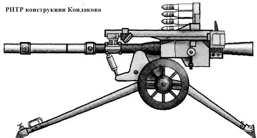 Но в СССР разработкой автоматического орудия ротного уровня занимался не только лишь Таубин. К примеру инженер Л.В.Курчевский, узнаваемый своими разработками безоткатных артиллерийских систем различного предназначения и многими считаемый не столько конструктором, сколько авантюристом, а начале 30-х сделал 37-мм безоткатное тяжёлое противотанковое ружьё РК. Курчевский планировал сделать его автоматическим, но так и не сумел. Зато в Ленинграде в КБ-КОН (конструкторское бюро Кондакова), в мае 1936 года был разработан проект автоматического реактивного безоткатного противотанкового ружья РПТР. Орудие состояло из качающейся части, механизма заряжания, верхнего и нижнего станка, также магазина на 5 снарядов. Лафет имел колёсный ход, а в боевом положении орудие устанавливалось на три раздвижные станины. Были сделаны и испытаны бывалые эталоны. При всем этом были достигнуты красивые характеристики : при весе в 63 кг РПТР по кучности и бронепробиваемости оказалось фактически схожим с 37-мм противотанковой пушкой ПТ эталона 1930 года. Но на вооружение РККА РПТР так и не поступило.