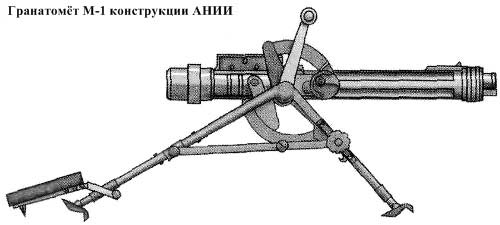 Также осенью 1937 года, в Артиллерийском научно-исследовательском институте (АНИИ) был разработан проект 45-мм автоматического гранатомёта, получившего обозначение М-1. Гранатомёт, также как и гранатомёт Таубина предназначался для поражения пехоты противника. М-1 состоял из ствола с кожухом, люльки, фронтальной рамы, станка и подушки. В качестве материалов конструкции применялись сталь, дюралюминий и медь. Орудие без боеприпасов весило всего 15,17 кг. При ведении огня стрелок был должен посиживать на специальной подушке, которая крепилась к станку.