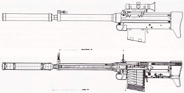Эта эскпериментальная винтовка была сотворена под особый патрон с бронебойной пулей калибра 12,7х64 мм, комплектовалась глушителем, имела газоотводную автоматику с перекосом затвора и работала исключительно в самозарядном режиме. Магазин имел ёмкость 10 патронов. Винтовка имела обыденные прицельные приспособления и могла оснащаться оптическим и ночным инфракрасным прицелом. Больше об этой очень увлекательной винтовке у меня инфы нет. Буду признателен всем, кто такой может поделиться.