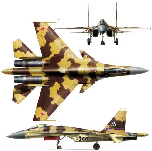 Тактико-технические свойства Су-37 Размах крыла 14,70 м; длина самолета 22,18 м; высота самолета 6,43 м. МАССЫ, кг: обычная взлетная 25.700 наибольшая взлетная 34.000. пустого 18.400. ЛЕТНЫЕ Свойства. Наибольшая скорость 2500 км/м; наибольшая скорость у земли 1400 км/ч; практический потолок 18.000 м; практическая дальность без ПТБ 3200 км; практическая дальность на максимально малой высоте 3450 км; перегоночная дальность с одной дозаправкой в воздухе 6500 км; надобная длина ВПП 1200 м.