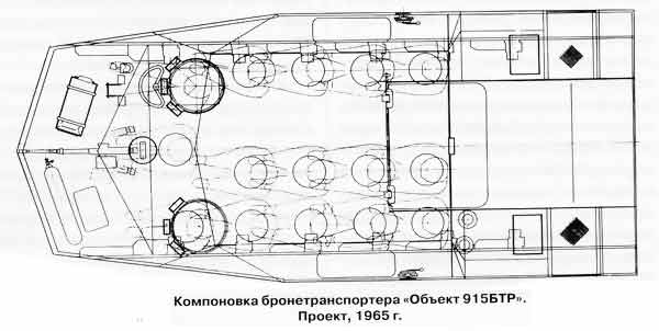 Бронетранспортер «Объект 915БТР» предназначался для транспортировки десанта и разных грузов на поле боя. В качестве главного орудия в носовой части корпуса по оси машины устанавливался 7,62-мм пулемет ПКТ. В состав экипажа машины заходил один человек - механик-водитель, который располагался в отделении управления у правого борта корпуса. Такое размещение механика-водителя позволяло правильно использовать площадь днища корпуса при разработке других модификаций машины. В состав перевозимого десанта входили командир, стрелок-пулеметчик (они располагались слева от механика-водителя) и 12 стрелков, которые размещались в три ряда вдоль бортов: один ряд - около правого борта и два - у левого. Около 2-ух задних мест десантников в правом и левом бортах имелись шаровые установки для стрельбы из личного орудия.