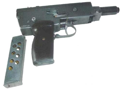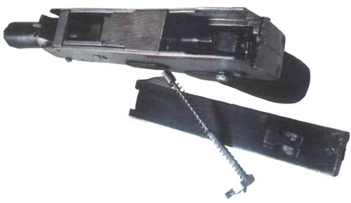 Ударно-спусковой механизм - курковый, со сокрытым поворотным курком и цилиндрической винтообразной боевой пружиной, допускает ведение одиночного и автоматического огня. Кнопочный переводчик видов огня размещен над пистолетной ручкой. Имеется неавтоматический предохранитель. После вылета пули из канала ствола и прохождения ею суженной части («вспомогательного ствола») расширительной камеры последующие за пулей пороховые газы оказывают давление на переднюю стену расширительной камеры. Камера с задней опорной втулкой движется вперёд, а возвратно-поступательный механизм приводит в движение затворную раму. Вариантов этого механизма, призванного движение надульника вперёд конвертировать в движение затворной рамы с затвором в обратном направлении, предложено несколько - реечно-шестерёнчатый, цепной и тросовый (с 2-мя блоками).