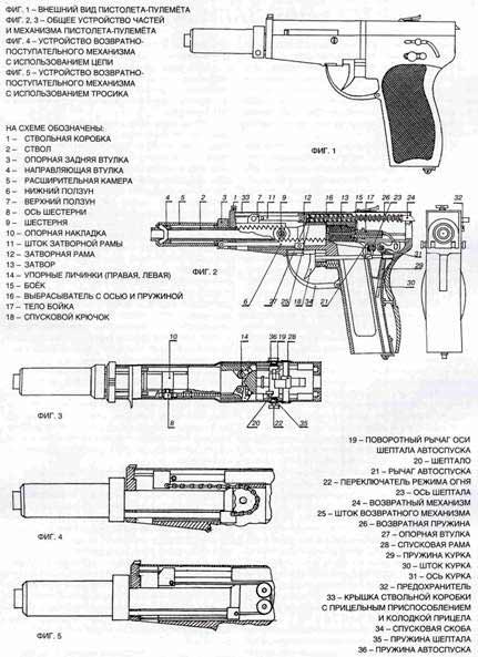Устройство орудия, предлагаемое П.Н. Черкашиным, можно осознать по приводимым чертежам пистолета. Газовый движок выполнен последующим образом. На выступающую из ствольной коробки дульную часть ствола надет подвижный надульник, включающий расширительную камеру и заднюю опорную втулку, жёстко связанную с затворной рамой через «возвратно-поступательный механизм». Движение надульника вперёд и вспять ограничивает направляющая втулка, укреплённая на дульной части ствола. Запирание канала ствола делается затвором при помощи 2-ух симметричных качающихся боевых упоров (личинок), встающих на опорные поверхности ствольной коробки. Движением затвора управляет затворная рама, которая своими наружными пазами движется по выступам ствольной коробки. Затвор, подвижно соединённый с затворной рамой телом ударника, движется по её внутренним пазам. Возвращение деталей автоматики вперёд создают возвратимые механизмы с цилиндрическими винтообразными возвратимыми пружинами.
