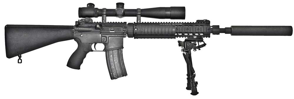 Глушитель и сошка Винтовка Mk12 MOD1 SPR поставляется вместе с глушителем 12-й модели SPR MBS 5,56 mm Precision Suppressor. Этот глушитель делается компанией OPS Incorporated. Он просто навинчивается на компенсатор, находящийся на дульной части винтовки; манжета, надвигающаяся на ствол, служит для центрирования. При стрельбе без глушителя компенсатор обеспечивает уменьшение отдачи и подброса дульной части. Благодаря отводу пороховых газов в стороны и ввысь он, не считая того, препятствует возникновению туч пыли при стрельбе. Отверстие в дульной части компенсатора на 0,762 мм больше, чем поперечник пули. Глушитель имеет длину 216 мм и поперечник 38 мм. Он делается из легированной стали серии 300, свариваемой взрывом. По данным изготовителя, продуктивность глушения звука составляет 40 дБ. Сошка винтовки Mk12 MOD1 SPR представляет собой модель HBRM-S компании Harris Engineering. Её опоры могут удлиняться со 153 до 228 мм с шагом 25 мм. Встроенный в основание сошки шарнир, усилие поворота которого может регулироваться, позволяет стрелку устранять сваливание винтовки на неровной поверхности. Установка сошки осуществляется средством выпускаемой компанией Knight's Armament монтажной планки, на нижнюю планку Пикатини цевья.