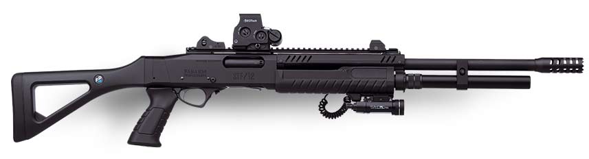 Похоже, что компания «Fabarm» попала в точку, создав особенное подразделение Fabarm Professional со своим значком, специализирующееся на производстве «тактических» ружей. Первым результатом его деятельности стал ужасающего вида помповый дробовик STF/12 Compact. 5 стволов разной длины, включая одиннадцатидюймового коротышку. Аккуратнейшее выполнение - начиная от легкосплавных вставок в цевье, обеспечивающих невиданную плавность хода. Съемная планка Пикатинни на шарнирном креплении, дульная насадка для вышибания дверей, раскладной приклад. Очень суровый зверек - но смиренный и послушливый, когда дело доходит до стрельбы.