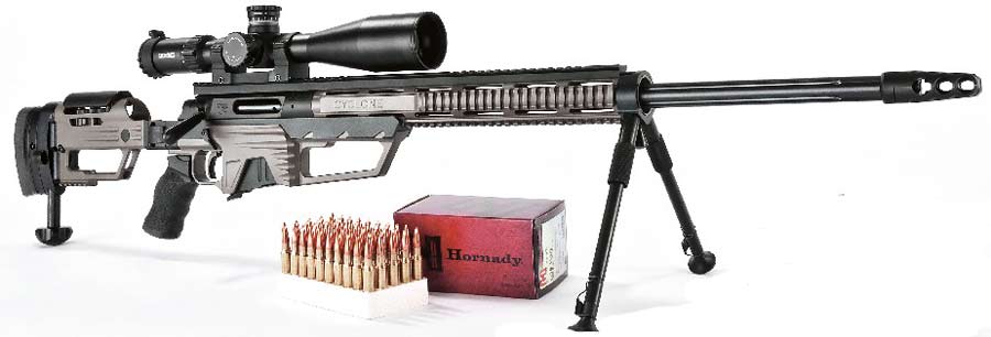 Защёлка магазина посиживает в комфортном месте за магазином, который отлично защищён подходящим конструктивным элементом шасси из лёгкого сплава. Магазин вмещает 10 патронов .308 Winchester, и его можно просто снаряжать, не травмируя пальцы. Патроны можно заряжать в магазин, не отделяя его от винтовки, и их не нужно будет продвигать в продольном направлении. Cyclone имеет рычажный двухпозиционный предохранитель. Когда рычаг стоит вертикально, то предохранитель включен. Для выключения предохранителя рычаг нужно повернуть вперёд, в положение под 45°.