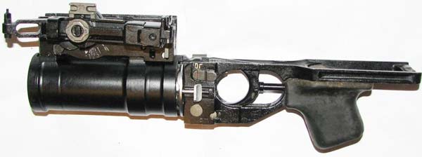 Для стрельбы из гранатомета ГП-25 был разработан 40-мм выстрел с осколочной гранатой ВОГ-25 (индекс 7П17). Выстрел соединяет воединыжды внутри себя гранату и метательный заряд в гильзе. Лимонка имеет ведущий поясок с 12 выступами, ведущими гранату по нарезам ствола. Выстрел ВОГ вставляется в ствол с дульной части без усилия до упора в торец казенника и удерживается пружинной защелкой. Спусковой механизм имеет устройство, блокирующее курок ударного механизма гранатомёта, если лимонка дослана не стопроцентно. По мере надобности выстрел быть может извлечен из ствола нажатием на особый экстрактор. Не считая этого у гранатомёта есть обыденный предохранитель флажкового типа, исключающий возможность несанкционированного выстрела при заряженном гранатомёте. Устройство ударно-спускового механизма ГП-25 не позволяет также произвести из него выстрел, если гранатомёт не установлен на автомат.